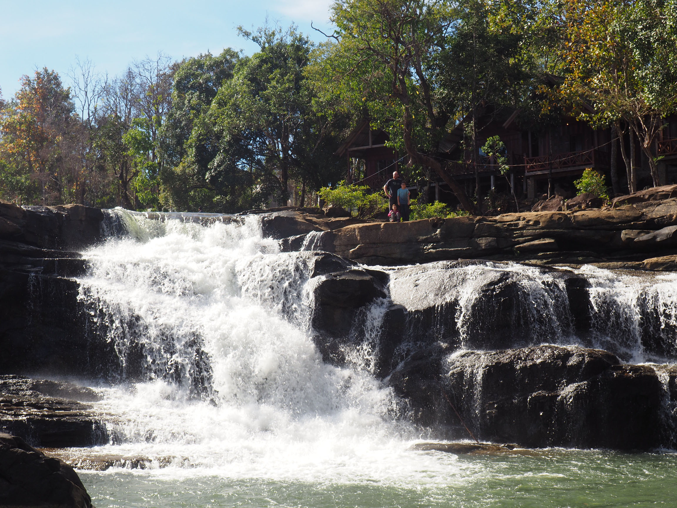 Il a été réhabilité par un thaïlandais tombé amoureux du lieu. Un très restaurant, un joli pont en bambou et tout un parcours avec des maisons traditionnelles dans la jungle, ainsi qu’une ethnie entièrement financée pour entretenir ce lieu. Comme il est dit sur le site de la province de Champassak ( cf. infos globetrotter), ce « zoo » humain peut paraitre déplacé, mais les personnes sont dans un cadre protégé, sauvegardé et sont ravis d’y être et de pouvoir vivre traditionnellement. Nous y avons passé une grande partie de la journée à parcourir la rivière et la forêt. Pour terminer la journée, nous sommes arrivés chez Mr Tim à Tat Lo. Un accueil sympathique et agréable à quelques dizaines de mètres de la rivière. Mr Tim parle français et, pour les petits et les grands, réalise de délicieux Pancakes !