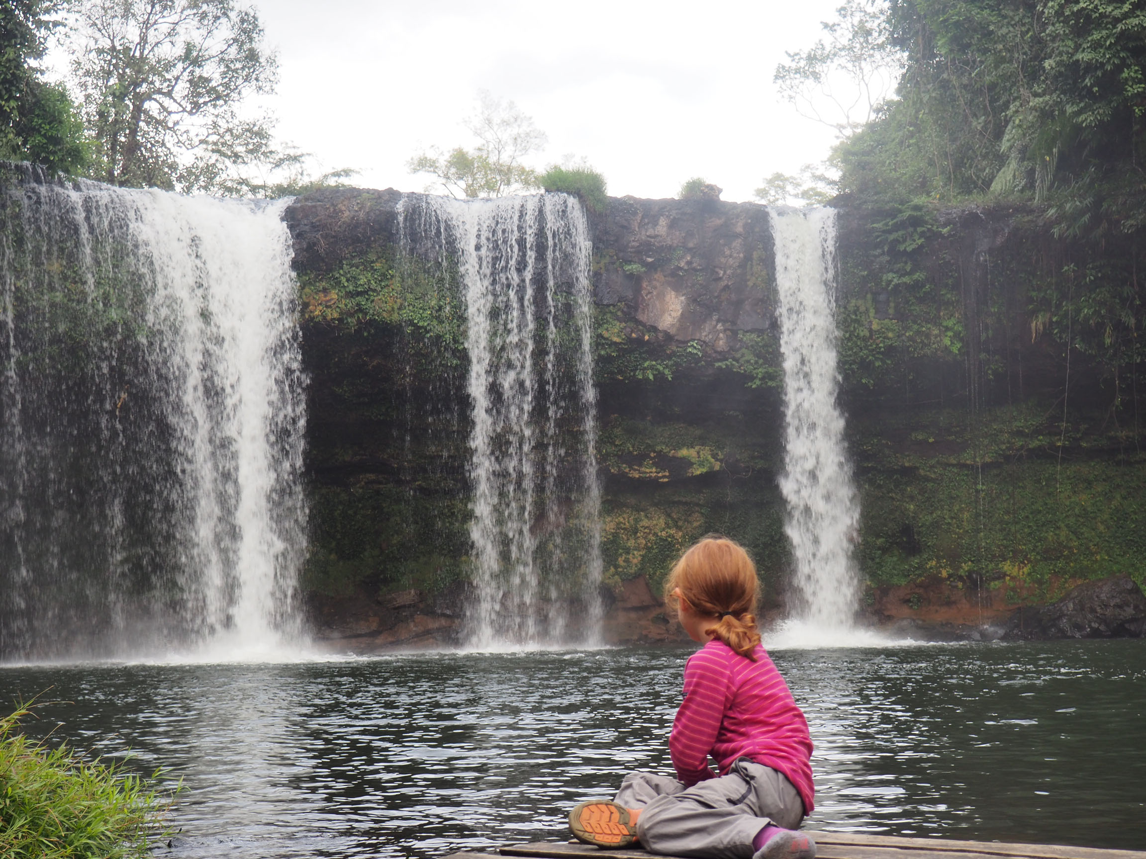 étape de Tat Lo à Paksong : 64Km. Tôt le matin, avant de reprendre la route, nous sommes allés admirer la première cascade de Tat Lo, accessible facilement à pied depuis notre auberge. Ensuite, nous avons repris nos engins pour rejoindre la seconde cascade à 2 Km à travers des petites pistes. Le début de l’aventure ! Et oui, il n’y a pas toujours de route, mais plutôt de la piste. Assez facile, mais pour le plaisir des enfants ont prend quelques trous ;-)… notre chemin nous mènera ensuite à l’impressionnante cascade de Tad Soung. Cette cascade est actuellement avec peu d’eau mais il est possible d’aller au sommet et d’avoir une vue sur la vallée et le plateau : imprenable ! Attention, tout de même, il n’y a pas de protection. Nous avons rallié ensuite, via Thateng, la ville « Far West » de Paksong. Une catastrophe cette ville ! Il n’y a rien. Presque pas d’hébergement. Une vraie galère. De plus, nous arrivons sous la pluie. Afin de réchauffer la famille et reprendre des forces, nous nous offrons une superbe nuit dans le resort situé sur le petit sommet au dessus de Paksong. Un bon lit, une bonne nuit et un bon petit déj et les DecloSacàDos sont à nouveau d’attaque pour le jour 3 !