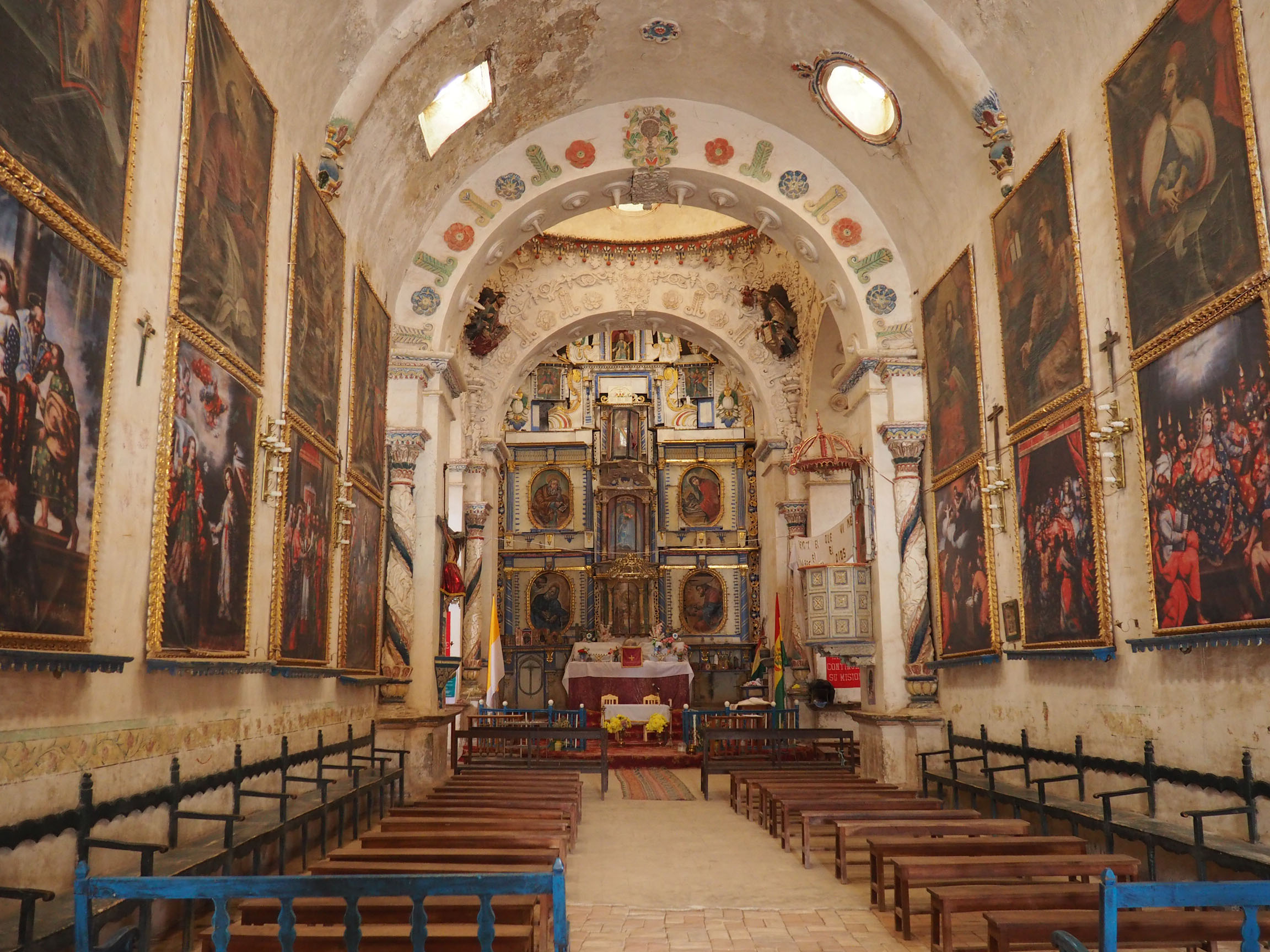Premier stop dans un hameau perdu. C’est la première fois qu’un tour fait un arrêt dans ce village. L’agence tente une nouvelle alternative, car le parc naturel, avec les lagunes rouges du sud, est sous la neige. Il est donc fermé. Excellent ! On nous ouvre l’église du village qui date de l’époque coloniale. Un bel édifice qui part en ruine. Les quelques habitants fondent beaucoup d’espoirs sur le tourisme pour avoir des fonds afin de préserver l’ouvrage. Quelques explications, quelques photos, on prend le chemin du repas ! Sympa, les 2 groupes font connaissance. Repas traditionnel bolivien pris, direction la Laguna verde (les lacs verts). A notre arrivée, mince les lacs sont bleus 😉.. Bon certes avec le soleil, il y a surement un reflet vert quelque part, mais notre cher Antonio est largement pardonné car il vient de nous conduire dans un cadre incroyable ! Splendide ! Unique ! Wahouuu.. la Bolivie, ça envoi du lourd ! du très très lourd au niveau paysage. Même Thomas reconnait que c’est presque aussi beau que la Nouvelle-Zélande. Cher lecteur que dire de plus, à part : apprécie ces quelques clichés !