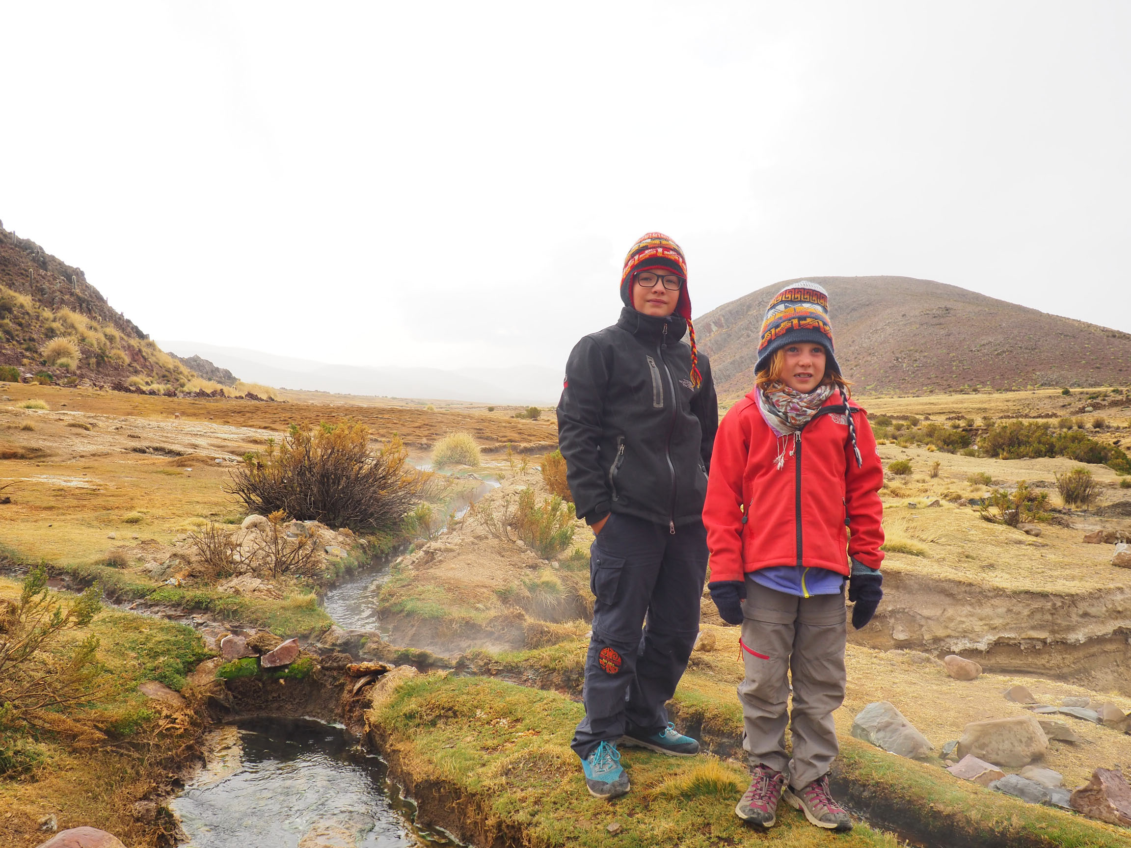 Lors de notre choix de l’agence Salty, avec Estelle et Annie, un point avait fortement retenu notre attention : « les HotSpring », ou « agua calientes » ! Vous imaginez bien que les trolls ont très vite appris l’anglais (et quelques rudiments d’espagnol) pendant notre TdM. Pour eux ce terme de HotSpring est synonyme de PISCINE !! Et bien, nous ne sommes pas déçus ! Après le diner, nous reprenons les voitures de nuit, en pleine montagne, pour atteindre un bassin complètement dans le noir. Dans la lueur des phares, nous voyons un grand nuage de vapeur. Excellent ! Nous sommes dans une région avec une forte activité volcanique. Nous sommes sur une source chaude. Il fait surement 0° dehors (nuit à 4800m d’altitude !!), on se change dans la nuit sur le bord du bassin et enfin on plonge sous les étoiles (ou presque, il y a beaucoup de nuages) dans un grand bain à 37°- 40° selon nos guides !! C’est chaud, trop chaud. On a même du mal à rentrer dedans, mais quel bonheur ! On cuit littéralement tous ensemble dans cette casserole naturelle. Tous le petit groupe est fin près pour une bonne nuit ! Quelle première journée !