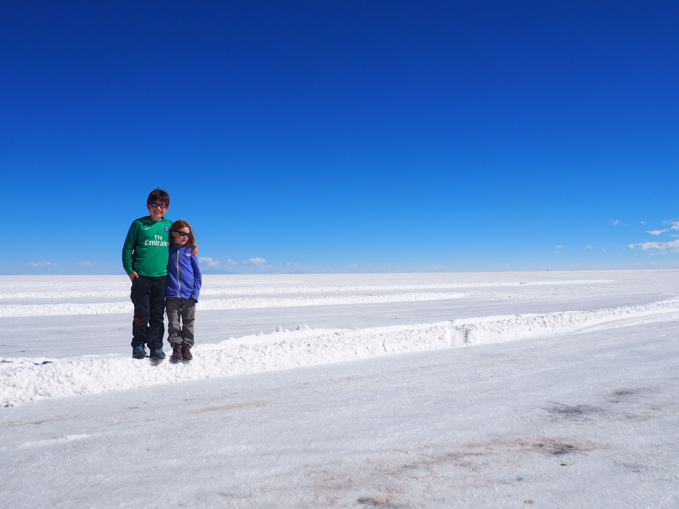 Voir des vigognes à l’état sauvage ! Génial, cela fait écho aux travaux de recherche et de rédaction de Jeanne (article sur les variétés de Lama – ici). L’arrivée sur le Salar est une drôle de sensation, nous avons vraiment l’impression d’arriver comme sur une piste de ski. Le sel forme sous nos pieds comme une petite pellicule de neige, mais ce n’est pas froid et les boules « de sel » fond beaucoup plus mal que la neige ! STOP, Jeanne & Thomas vous arrêtez les batailles de boules de sel ! ça fait mal ! AHHH, les trolls !