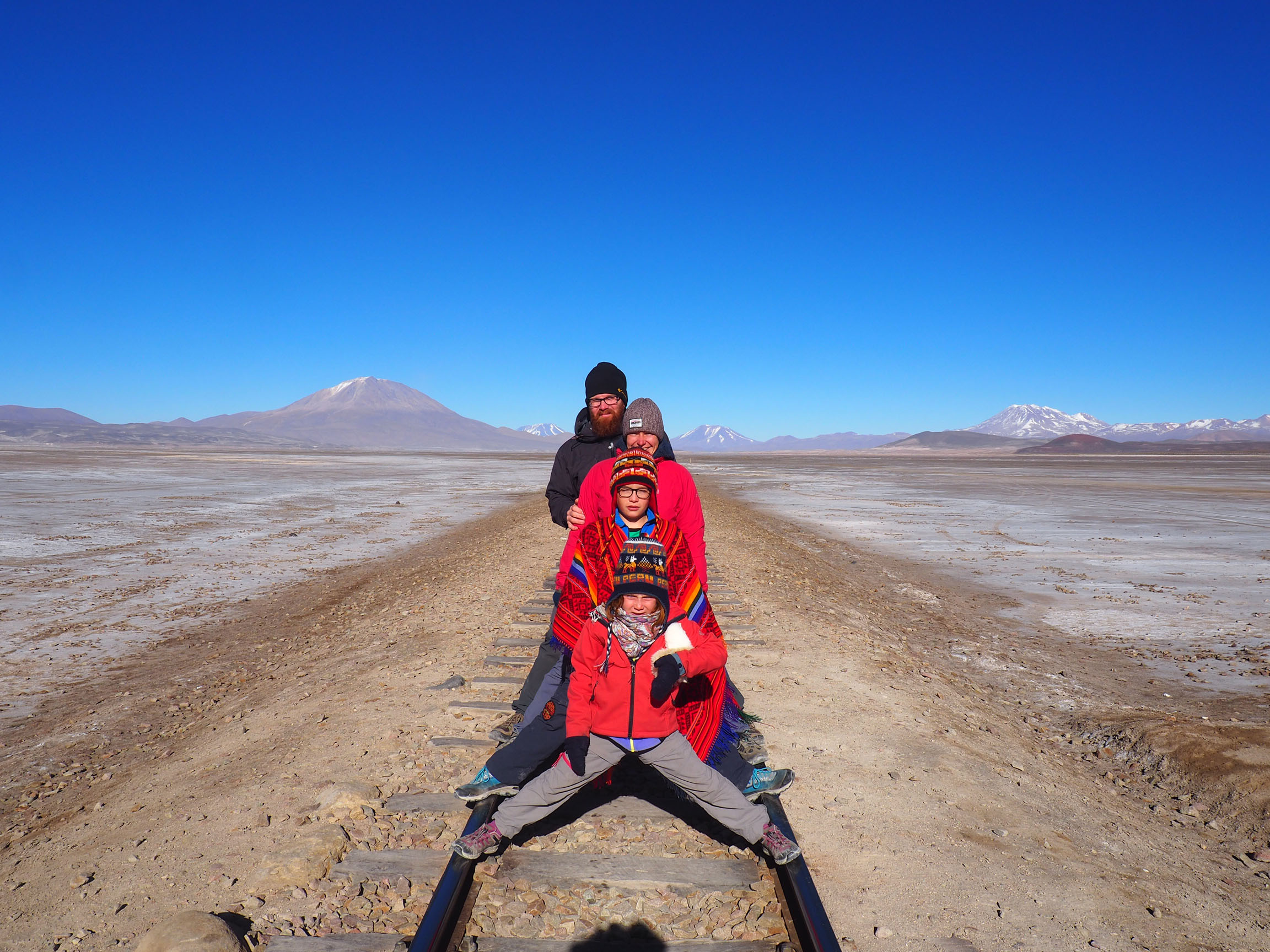 Ensuite, nous avons pris un bus de nuit qui nous a emmené à Uyuni, dans le sud de la Bolivie. Dans le terminal, nous avons rencontré Estelle et Annie, deux françaises, avec qui nous avons bien sympathisé. Arrivés à Uyuni, vers 6h du matin, dans une ville complètement GELÉE, nous décidons d’aller prendre un café ensemble. Ce sera le début d’une aventure commune de 4 jours ! Direction la recherche d’un hôtel, nous arpentons la ville pour terminer dans le même hôtel et décidons de faire le tour des agences ensemble. Nous nous décidons pour Salty Desert Aventour, que nous réservons pour le lendemain. Une journée dans Uyuni sera largement suffisante pour que nous nous rendions compte que la ville a peu, très peu d’intérêt à part son exceptionnel emplacement proche du Salar et de paysages fantastiques. Nous voici donc, l’équipe au complet, dès le lendemain, à l’agence. Nous y rencontrons l’équipe de l’autre jeep, Jérémy et Céline (deux marseillais), Béatrice, un couple d’anglais et leur guide Janet. Notre chauffeur, Antonio, est vraiment super, à l’écoute, avenant et drôle, nous avons vraiment passé 3 jours super avec lui.